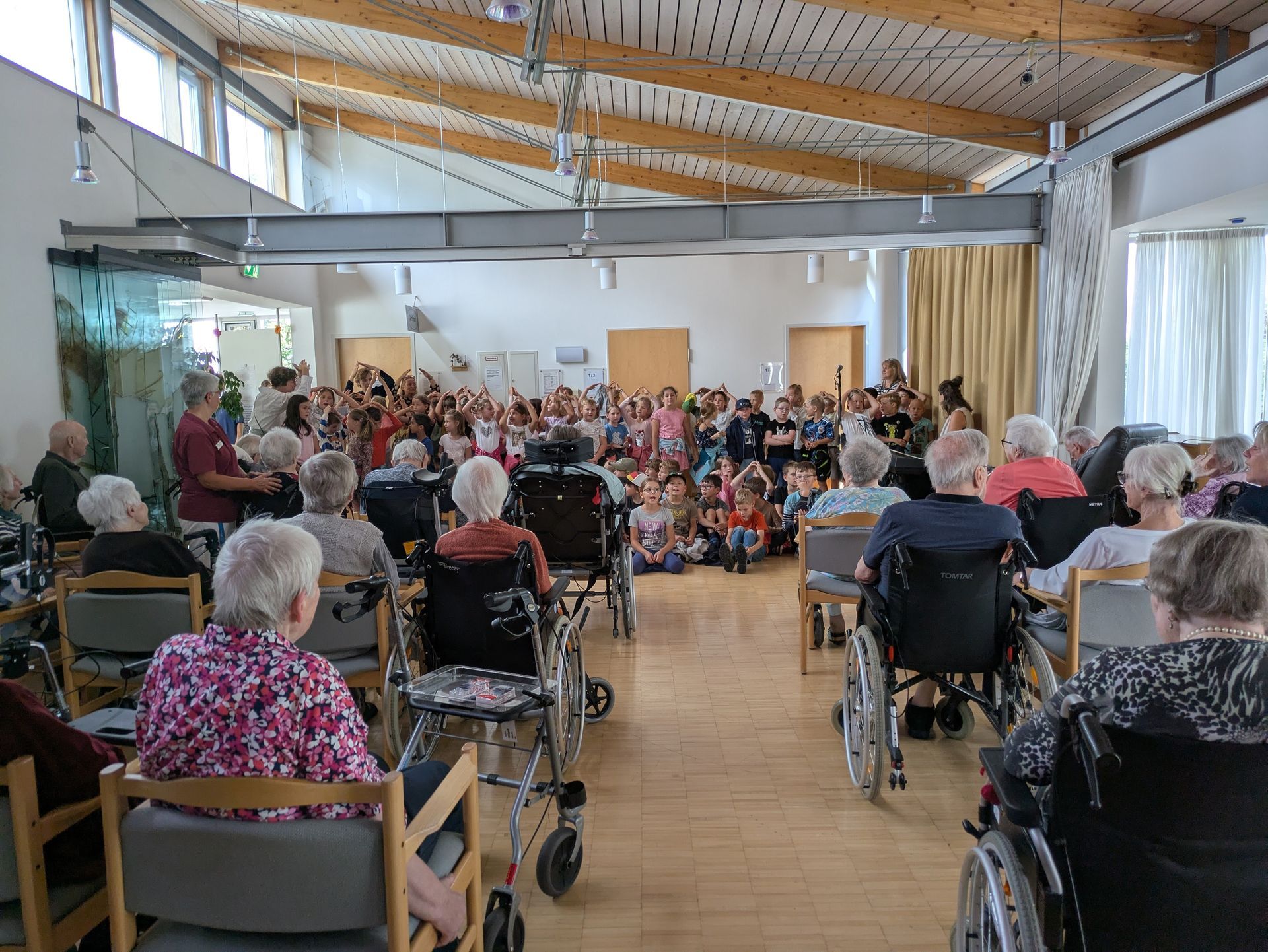 80 Kinder besuchten uns mit ihren Lehrerinnen und gaben ein Konzert für unsere Senioren. Die Begeisterung war auf allen Seiten groß und so manchem Bewohner standen Freudentränen in den Augen. Gestärkt mit kleinen Süßigkeiten machten sich die Schülerinnen und Schüler danach wieder auf den Weg in die Schule – nicht ohne versprochen zu haben, bald wieder zu kommen.